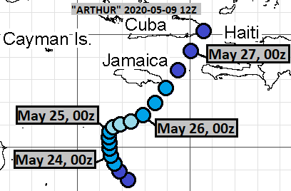 In the nine tracks (made before operationally recognized degeneration into remnant low), dissipation times ranged between May 24, 18Z and May 28, 12Z. Average was May 26, 21Z and median was May 27, 06Z.