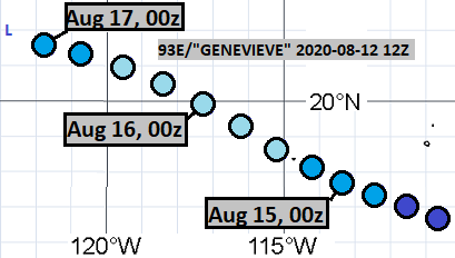 Invest 93E and Invest 94E were competing low level centers on the same trough. Eventually it was 94E, that became a tropical cyclone (Fausto). Since they were so closely related, for the purposes of this verification, tracks will be considered to depict Fausto, even if they correspond more closely to 93E.