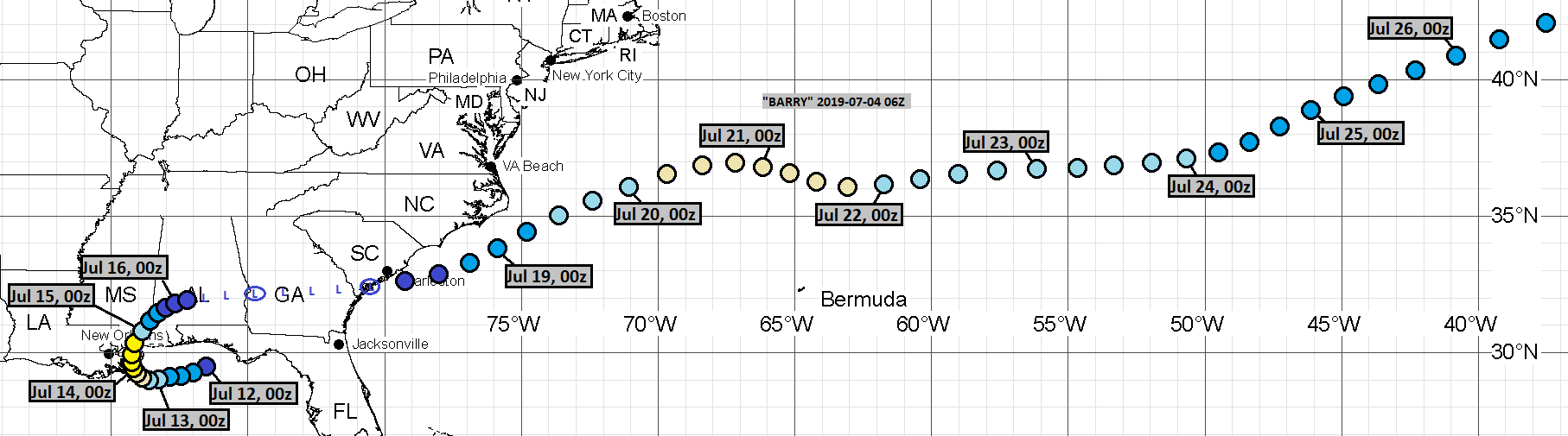 As of this analysis, best track positions are available July 7, 12Z thru July 14, 18Z, and as such, position comparisons are possible only for this timespan. In the absence of best track for the rest of Barry's existence, dissipation is assumed to be at July 16, 00Z.