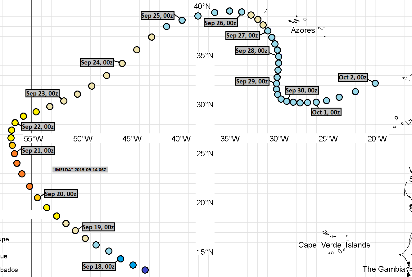 In the eight tracks, dissipation times ranged between September 19, 06Z and October 5, 12Z. Average was September 28, 00Z and median was September 28, 15Z.
