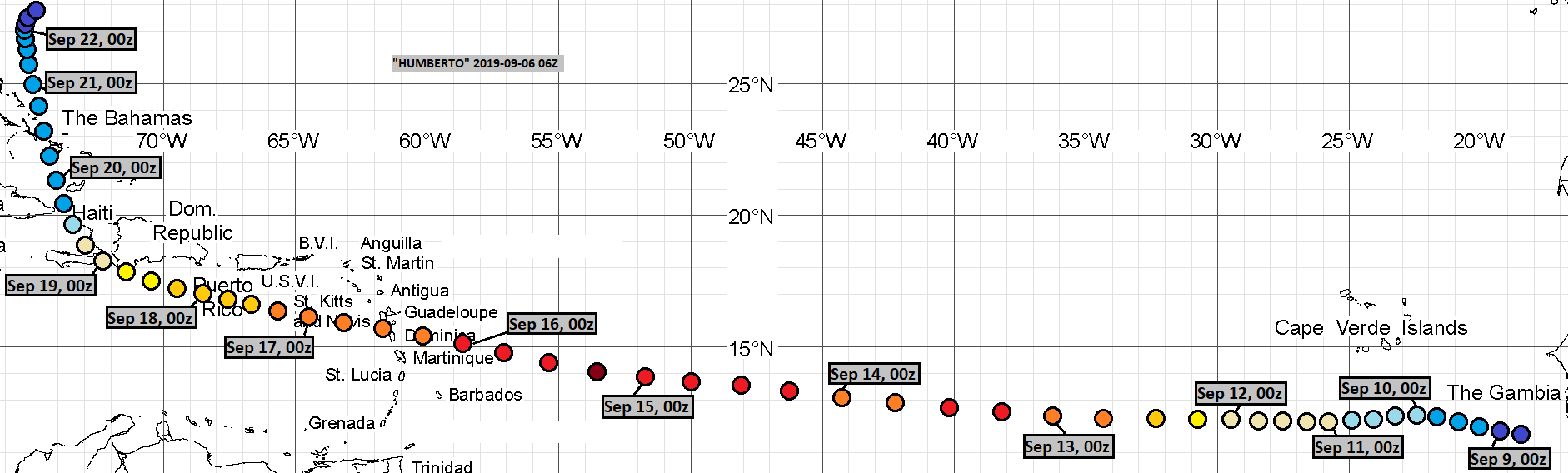 These tracks are identifiable with a tropical wave, shown extending south from Cabo Verde in the following synoptic chart.September 22, 06Z run: