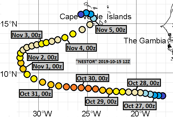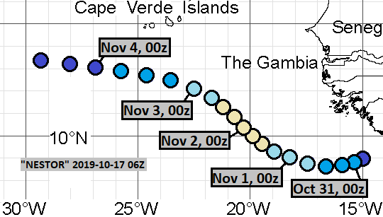 These are most closely identifiable with the trough extending SW from Senegal in the following synoptic chart. Only tracks at least partially west of prime meridian are shown.October 17, 06Z run: