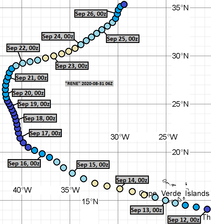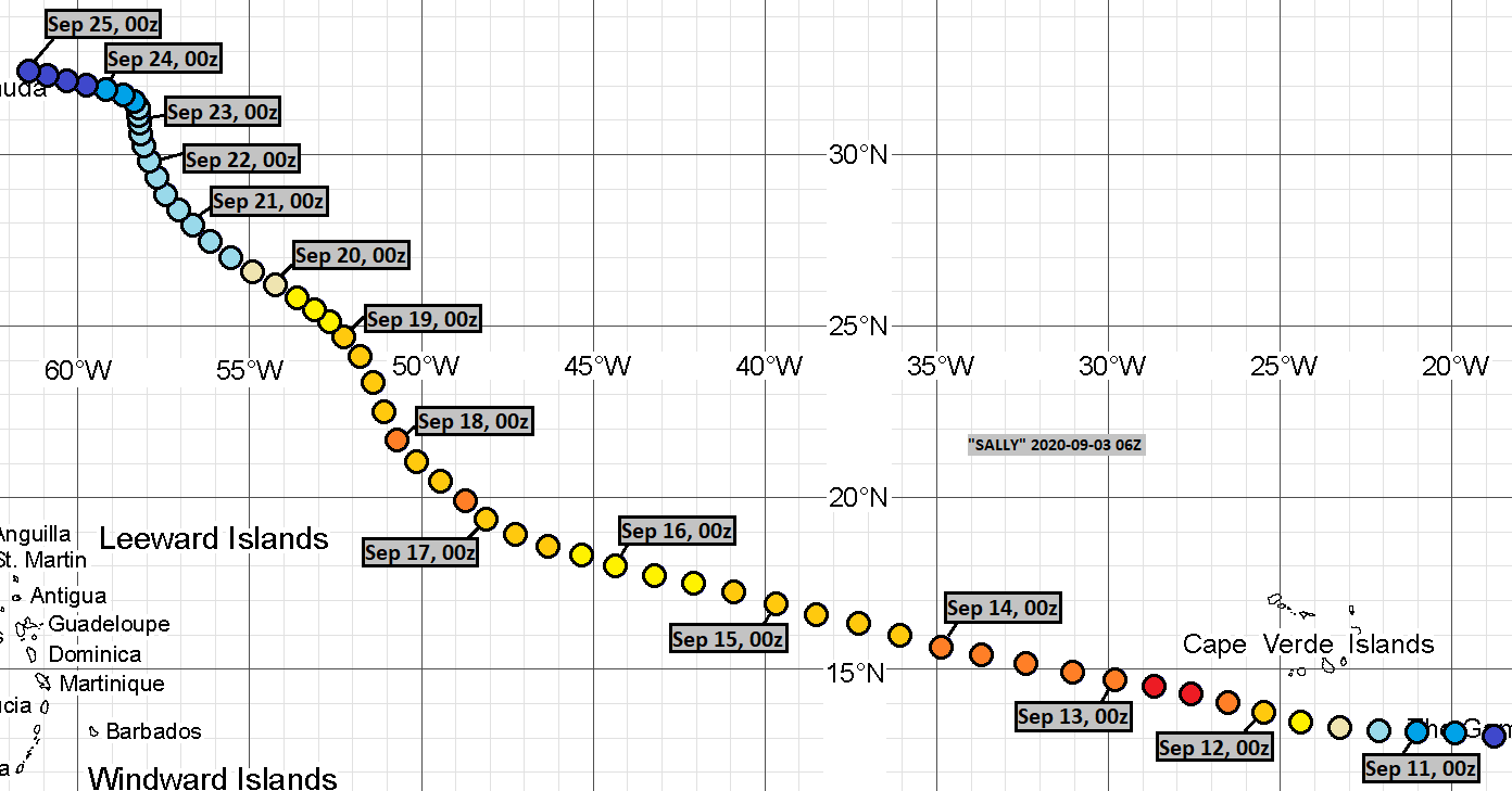In the six tracks (made before operationally recognized degeneration into remnant), dissipation times ranged between September 14, 18Z