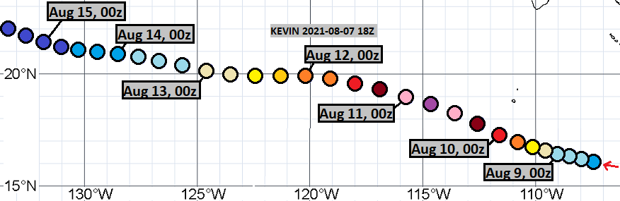 Above: Possibly the most ridiculous Eastern Pacific track of 2021. No, Kevin didn't reach 215 mph winds...